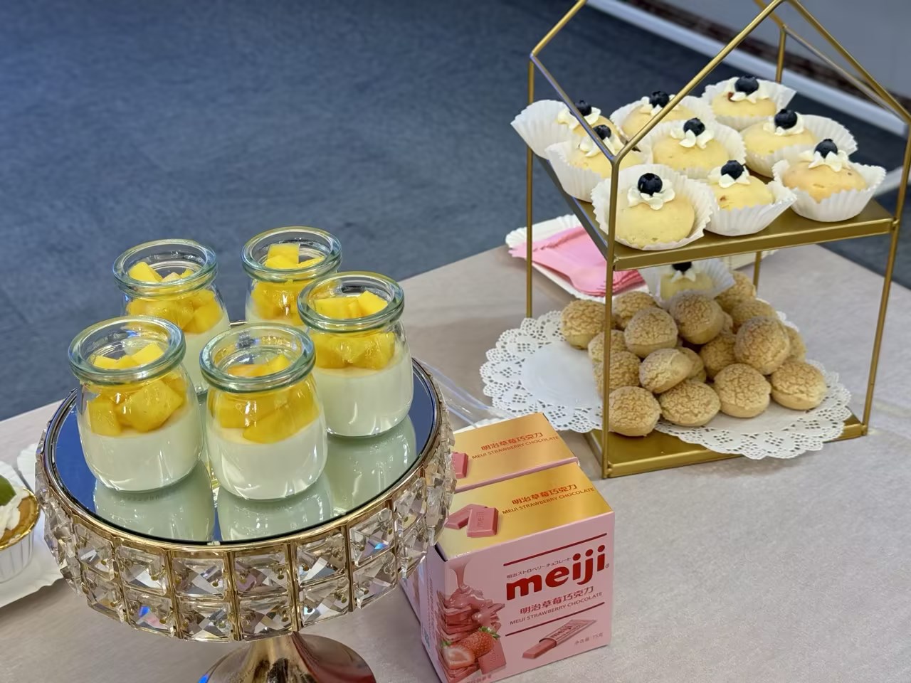 活动开始前,桌上已经摆满了各式各样的精致茶点。小巧的蛋糕、香甜的酸奶、缤纷的水果……每一口都是对味蕾的诱惑。