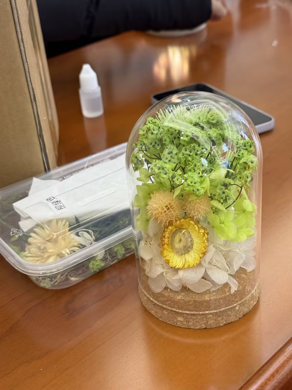 活动现场被装扮得温馨而雅致,桌上摆满了压花台灯所需的各式花材、永生花的精致配件、拓印所需的板子与刻刀、制作小花灯所需的彩纸与灯丝。
