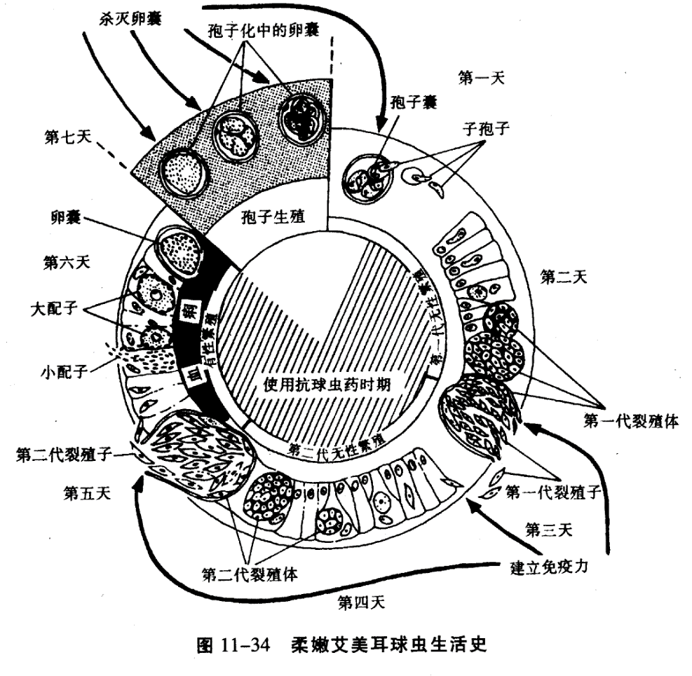 • 寄生于小肠前段,卵囊呈卵圆形,光滑。大小为(12~23)×(9~17)μm。具粒,无残体。孢子囊呈卵圆形,有斯氏体。