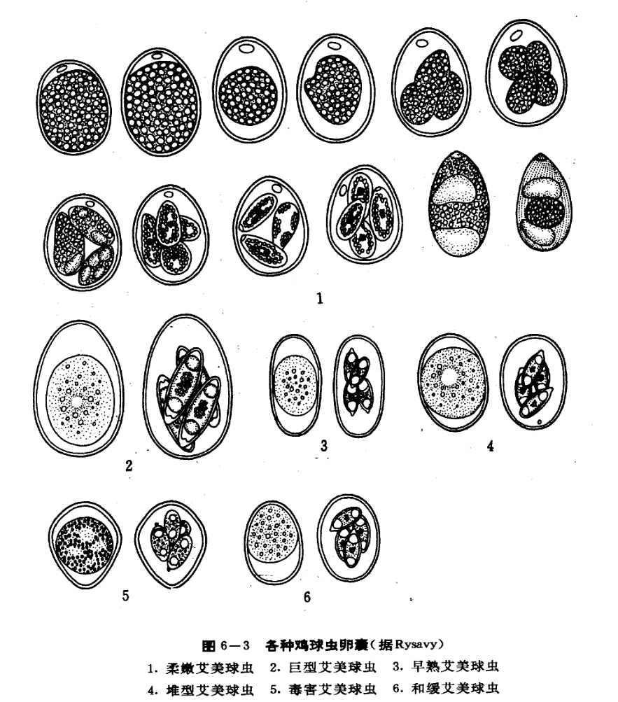 • 寄生于小肠后段、 直肠和盲肠近端区。卵囊大小为24.6×18.8μm,是鸡球虫中仅次于巨型艾美球虫的第二大型卵囊。形状指数为1.31。有一极粒,无残体和卵膜孔。裂殖体直径为30μm。孢子化时间为18h,潜隐期为120h。
