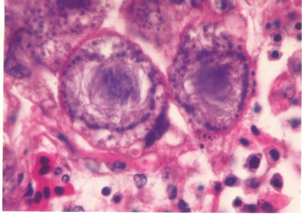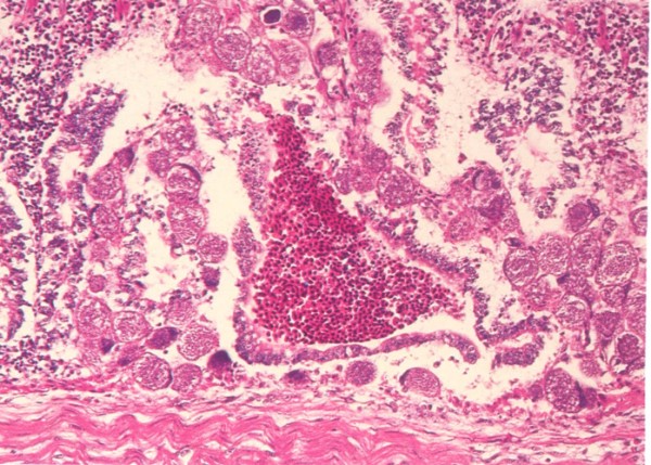 • 其第一、二代裂殖生殖在鸡小肠,第三代裂殖生殖和配子生殖在盲肠。卵囊呈卵圆形,大小为(12~29)×(11~24)μm,囊壁无色、光滑。具极粒,孢子囊呈卵圆形,有斯氏体,无残体。