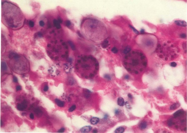 • 球虫卵囊壁在肌胃的机械作用下破裂,释放出孢子囊。孢子囊在十二指肠和小肠中部受胆汁、酶的作用下,孢子囊溶解,子孢子逸出,子孢子迅速侵入肠粘膜上皮细胞内,变为球形的滋养体。在感染后1~2天内,滋养体迅速生长,细胞核进行无性的复分裂,即裂体增殖。