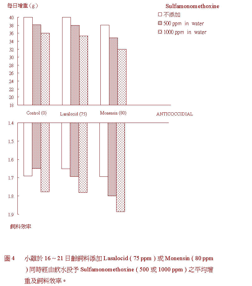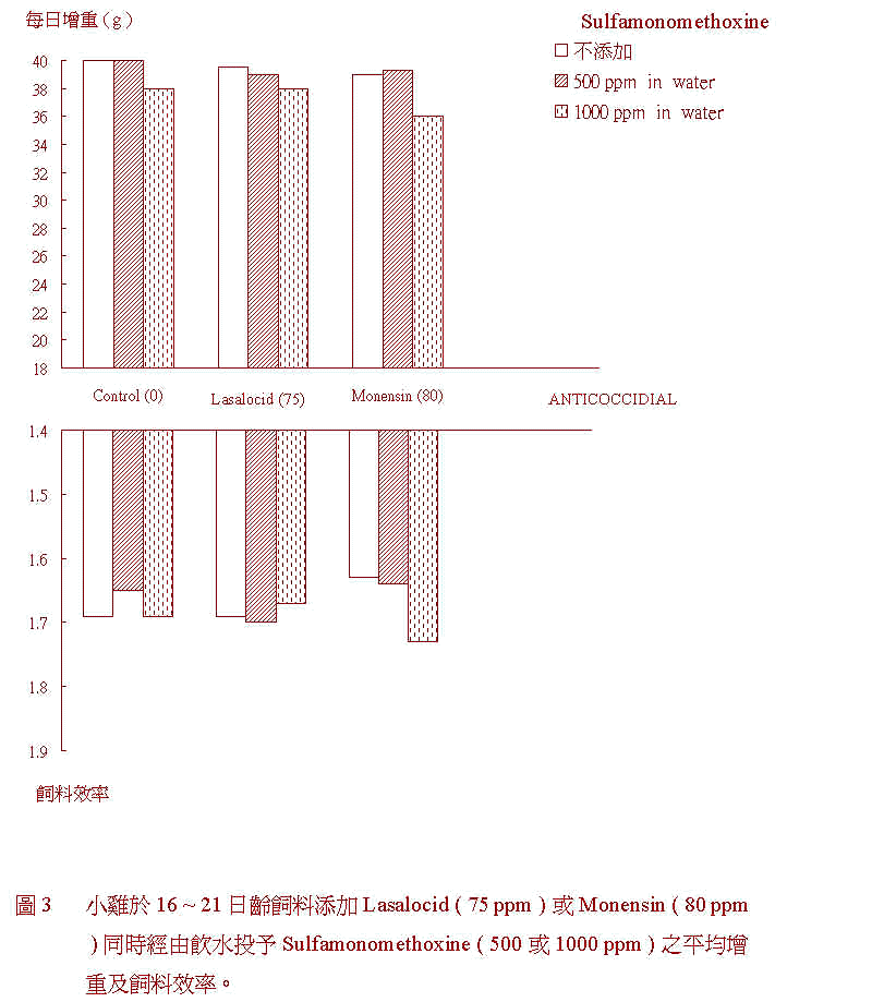 Sulfamonomethoxine Sodium (500或1000mg/l)并用5天(16-21日龄)之生产效能。