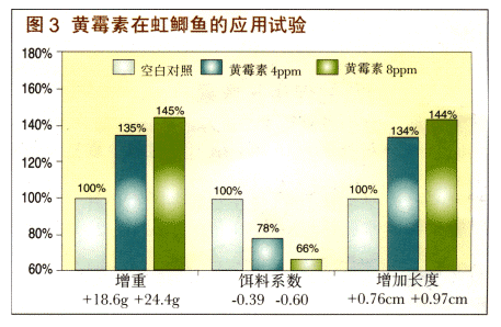 分别设黄霉素2mg/kg、4mg/kg、8mg/kg及对照组。15尾/组,每组两个重复。试验期30天。