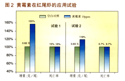 2次试验,每次设黄霉素10ppm组及空白对照组,每组15尾虾,实验期30天。