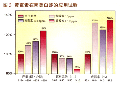 设黄霉素3.3、10.55、17.75ppm组及空白对照组,每个组2个虾池,实验期135.5天。